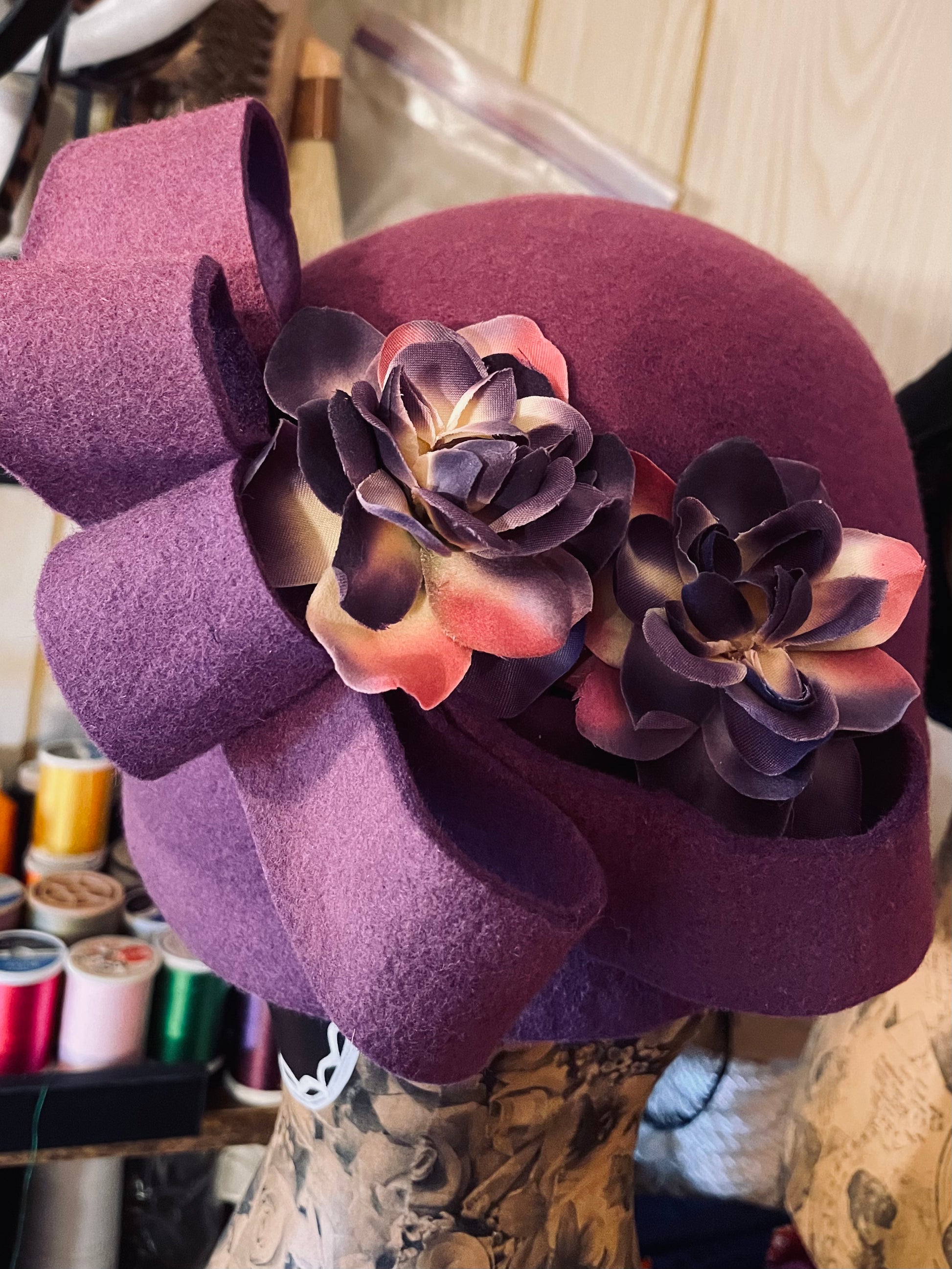 Crafted from high-quality purple wool felt, this elegant cloche hat features delicate purple rose accents and matching purple bows, creating a refined and timeless look. Its soft, structured design offers both comfort and style, making it a perfect accessory for sophisticated occasions or everyday wear with a touch of vintage charm.